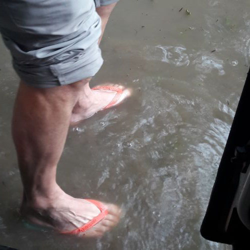 Unsere erste Nacht im VW California war regnerisch und stürmisch und beim Aufstehen stehen wir im Wasser. Die Bretagne grüsst...