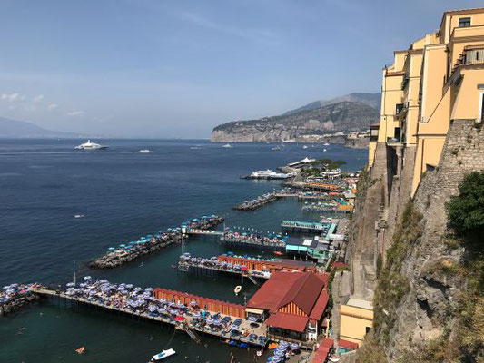 Weiter geht’s um die Berge rum Richtung Sorrento. Einen Stau umfahren wir dank dem Navi, aber kurz vor Sorrento stehen wir 30 Minuten wegen eines Unfalls. Die beiden demolierten Autos lassen erkennen, dass wieder einmal einer die Linkskurve geschnitten hat. Eine Unart der Italiener, die uns oft den Kopf schütteln lässt. Bequem fahren wir in Sorrento ins 2.10 m hohe Parkhaus und schlendern durch die Gassen. Hier ist es sehr mondän und es hat viele ausländische Touristen. Der Ausblick auf die Bucht von Napoli und den Vesuv ist «mozzafiato».