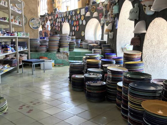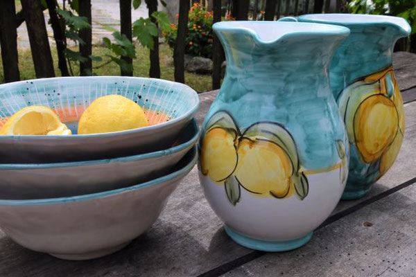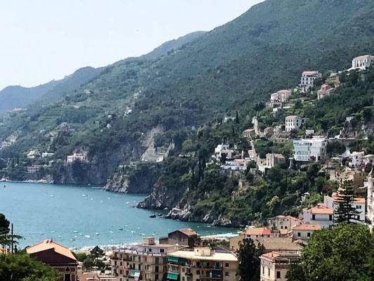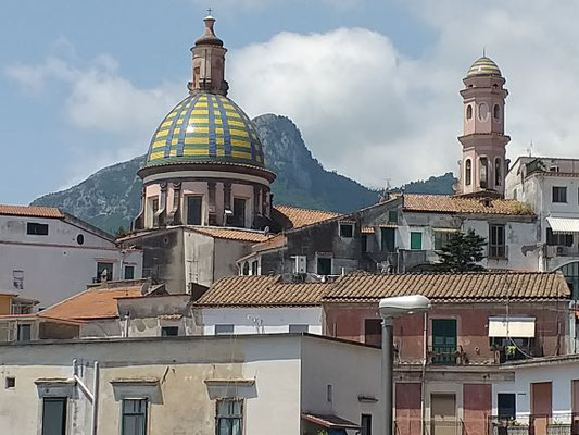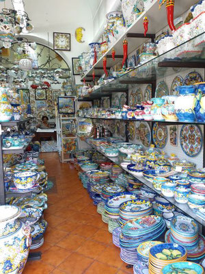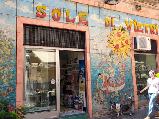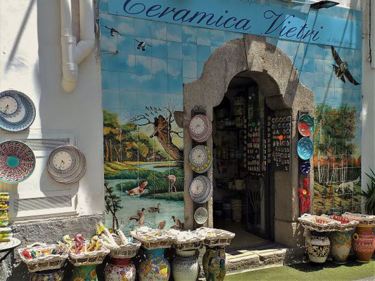 Erstmals erleben wir, was es heisst, mit dem Auto an der Amalfiküste unterwegs zu sein. Auf der Suche nach einem Parkplatz fahren wir erst in eine Sackgasse, wo wir knapp noch wenden können. Schlussendlich finden wir einen ganz unten am Meer. Aber wie kommen wir von hier ins Zentrum? Merice erfragt den Weg bei einem Einheimischen. Es gibt keinen Lift, keine Treppe und keinen Fussweg. Einzige Möglichkeit, die Strasse wieder raufzulaufen. Freundlicherweise nimmt uns Beppe spontan in seinem Auto mit und erspart uns damit den 20-minütigen schweisstreibenden Aufstieg. Vietri ist ein schmuckes Städtchen und überall trifft man auf die Majolika-Kacheln. Wir durchstöbern die vielen Keramik-Shops und finden schlussendlich unsere lange gesuchten Wasserkrüge.