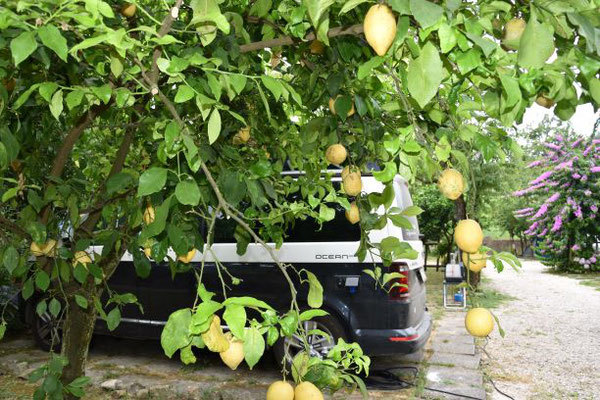Wir tanken, ergänzen unsere Vorräte bevor im Agricampeggio Oasi verde in Piano di Sorrento einfahren. Michele und Ursula erwarten uns schon und weisen uns auf unseren schattigen Platz. Hier haben wir eine kleine grüne Oase gefunden. Acht liebevoll gepflegte, grosszügige Stellplätze inmitten von Zitronenbäumen und Bougainvillea. Ursula erklärt uns ihre Idee vom naturbelassen Platz, der wie die typischen sorrentinischen Gärten angelegt ist.